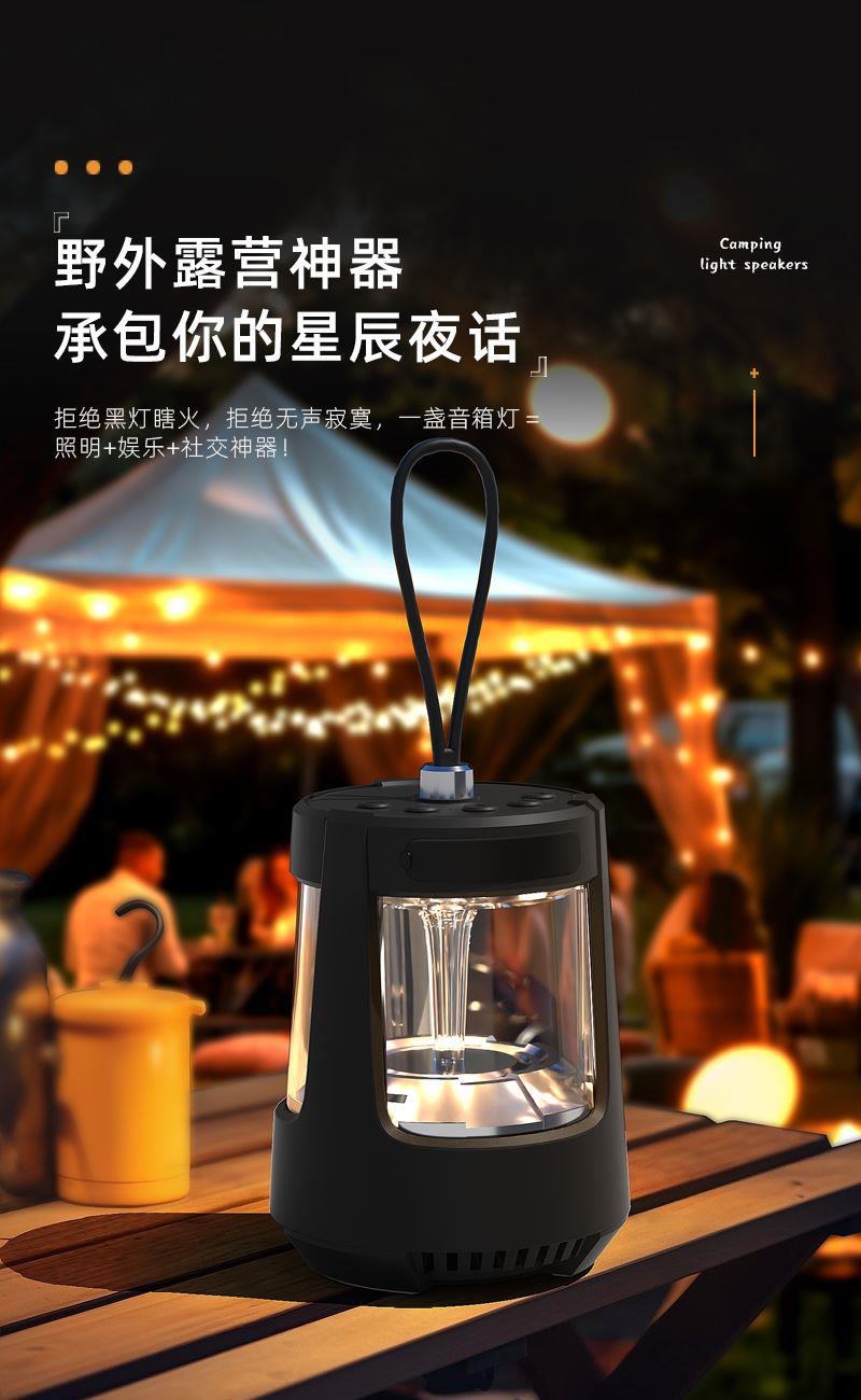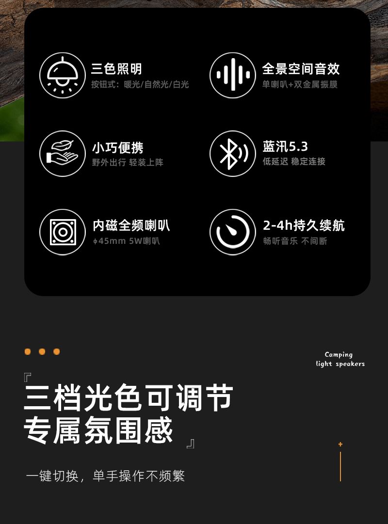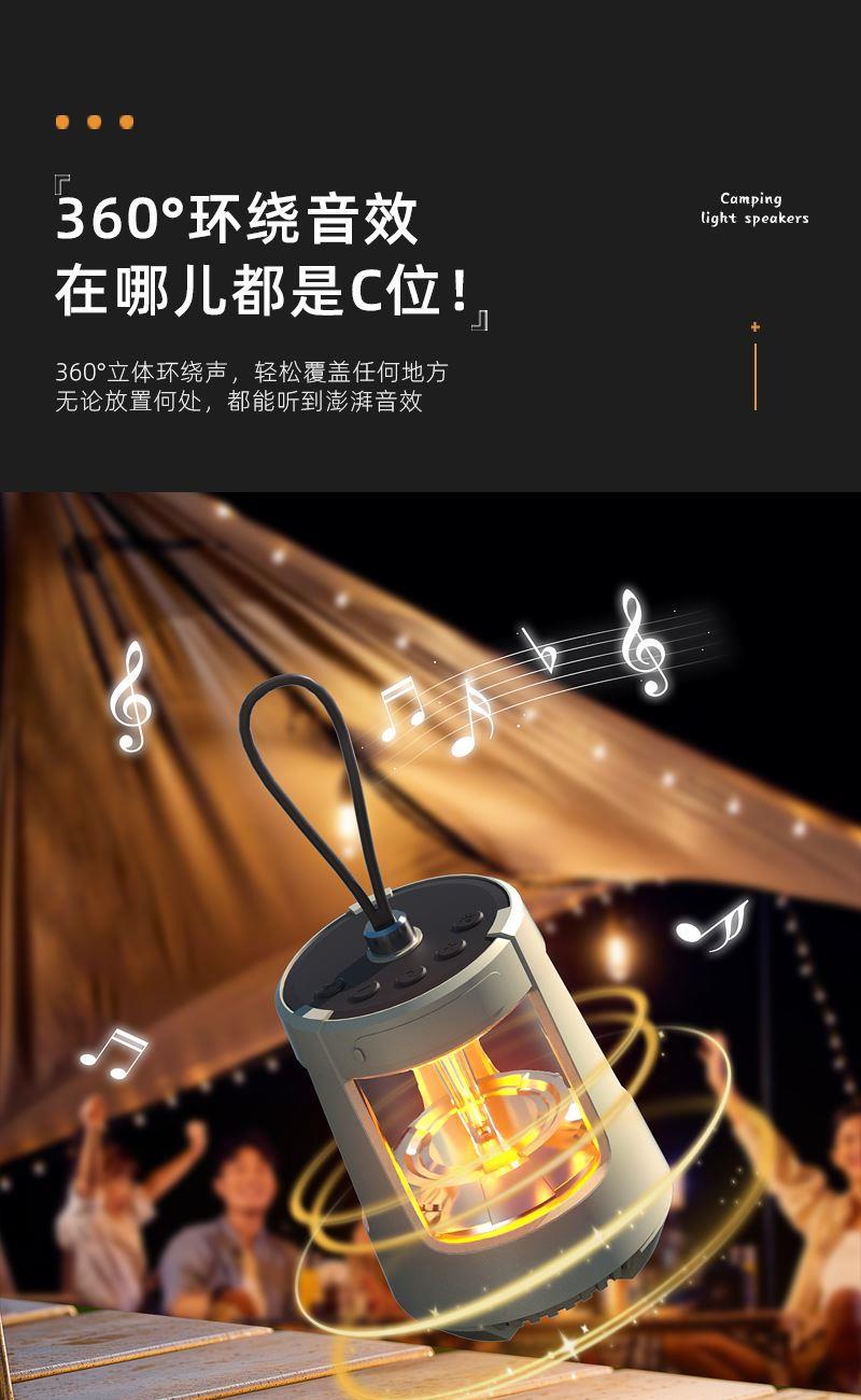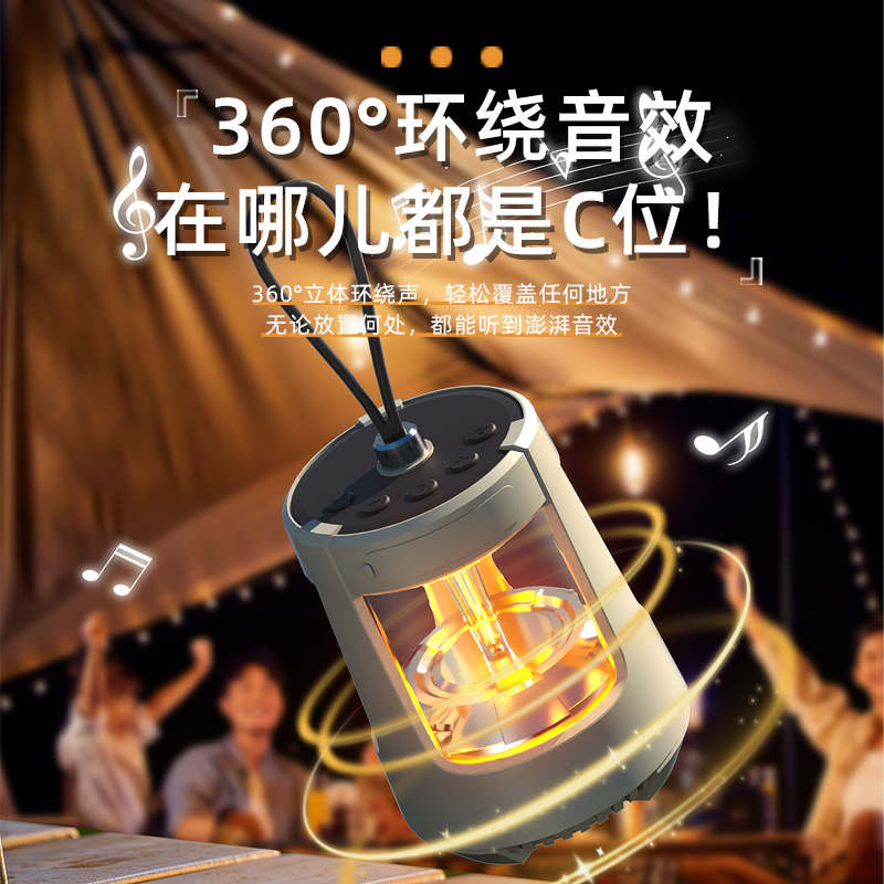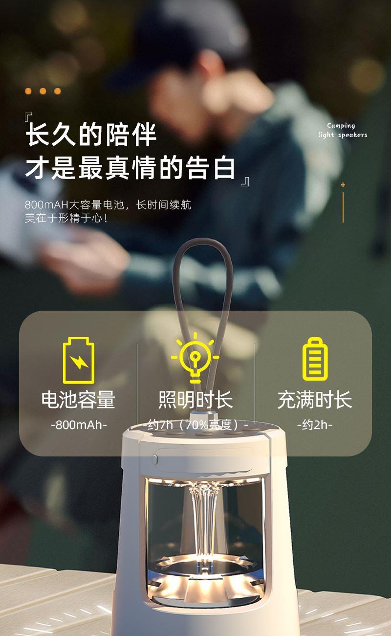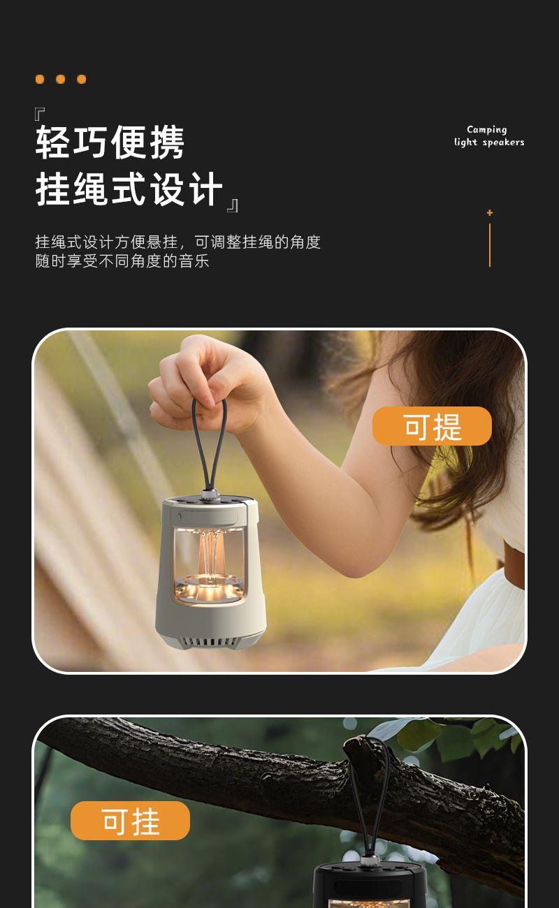 ◆內置音響功能,頂部硅膠提手便于攜帶,底部防滑設計適合戶外場景,整體兼具照明、音樂播放與露營儀式感