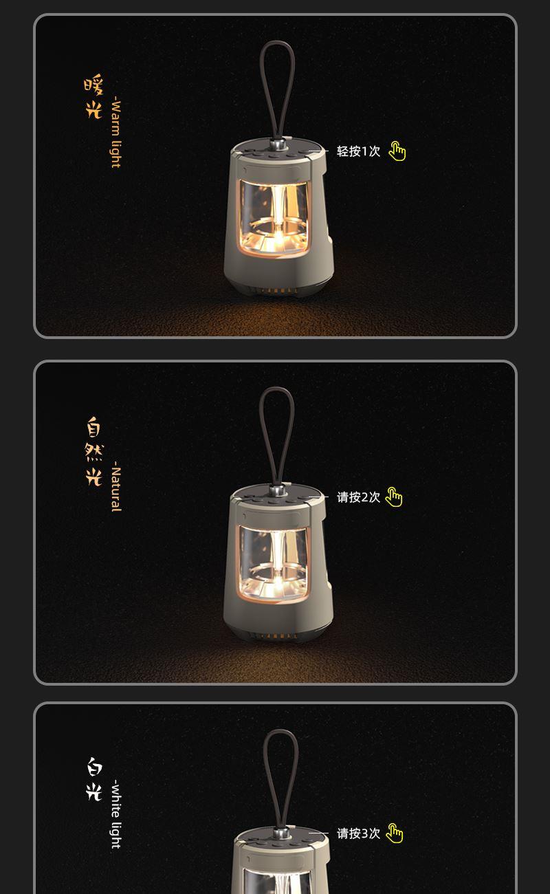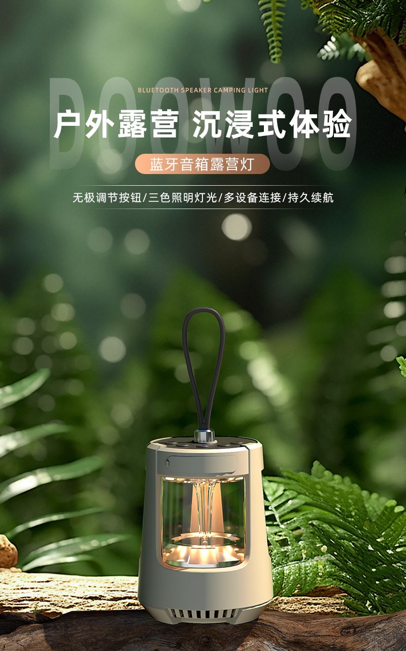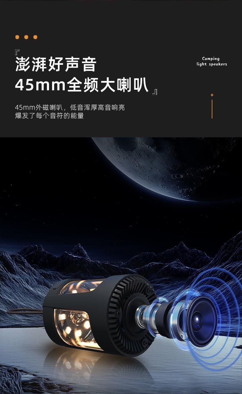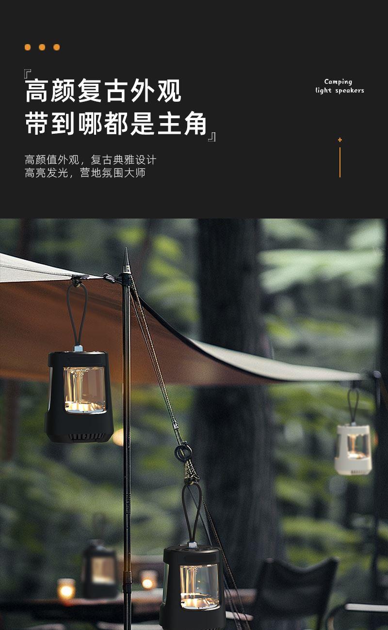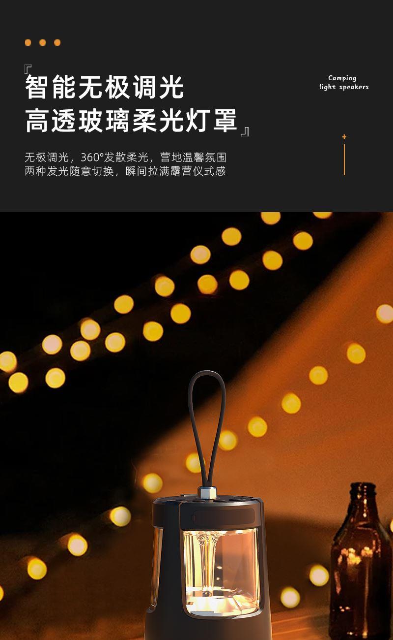 ◆內置音響功能,頂部硅膠提手便于攜帶,底部防滑設計適合戶外場景,整體兼具照明、音樂播放與露營儀式感