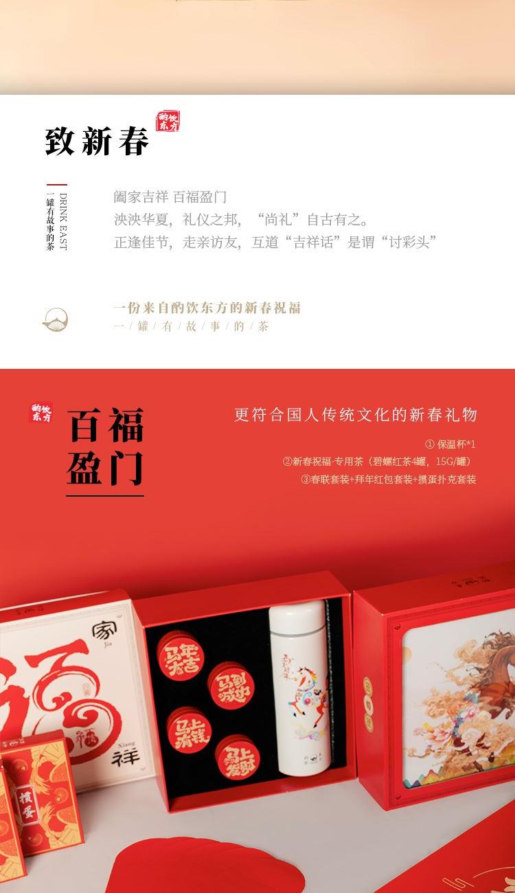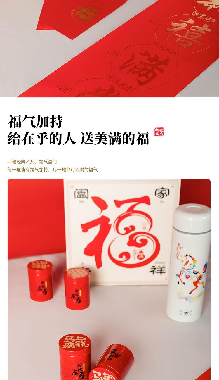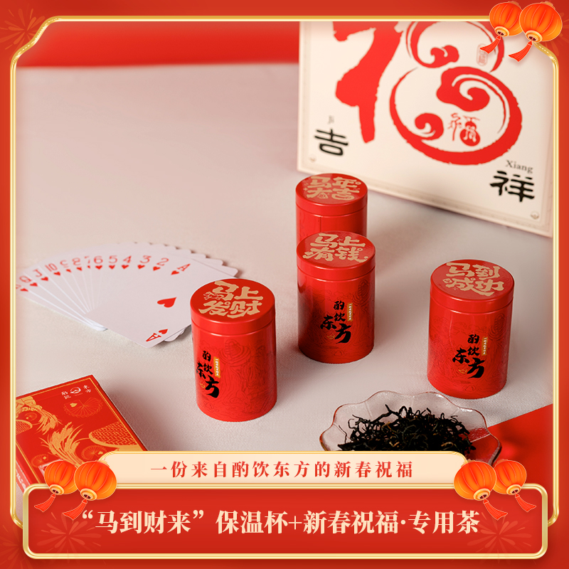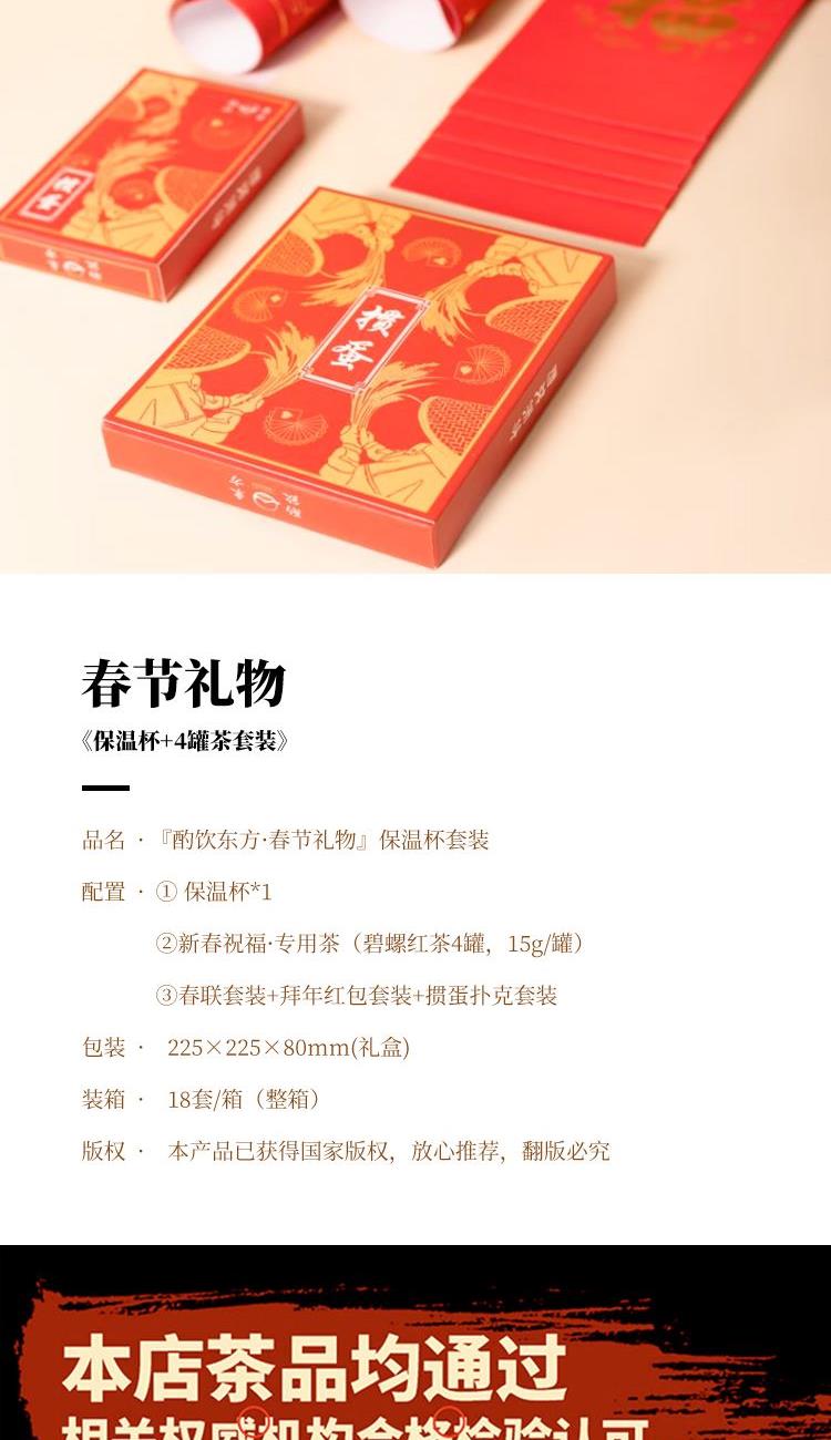 配置: ①保溫杯*1 ②新春祝福·專用茶(碧螺紅茶4罐,15g/罐) ③春聯套裝+拜年紅包套裝+摜蛋撲克套裝