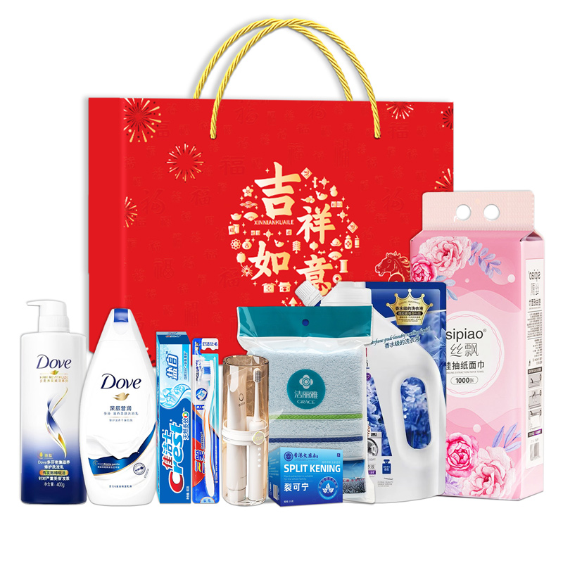 禮盒尺寸:34*8.5*27cm 包裝尺寸:69*37.5*56.5CM 產品配置:(香型隨機) 多芬洗發水400ml 多芬沐浴露550ml 佳潔士牙膏90g 三笑牙刷 透明便攜洗漱杯 純棉毛巾(73*33cm) 蔬果園洗衣液500g 香港大藥房裂可寧35g 絲飄掛抽式紙巾(1000張) 精美禮盒