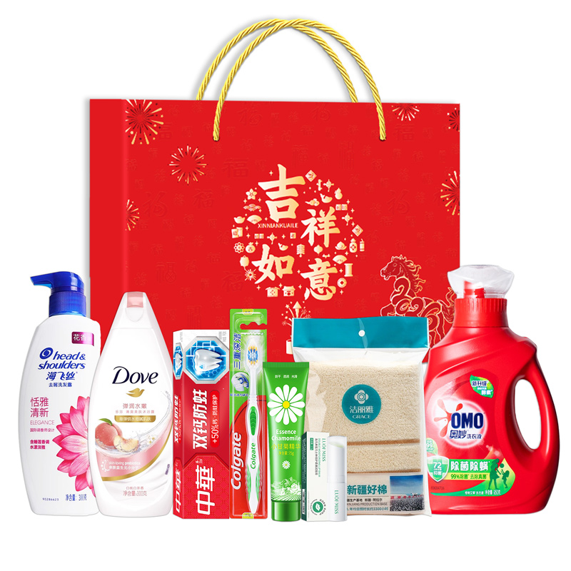 禮盒尺寸:32*8.5*24.5cm 包裝尺寸:66* 46.5*51 CM 產品配置:(香型隨機) 海飛絲洗發水300ml 多芬沐浴露300ml 中華牙膏90g 高露潔牙刷 潔麗雅毛巾(69*33cm) 凡士林潤唇膏2.7g 洋甘菊護手霜75g 奧妙洗衣液950g 精美禮盒